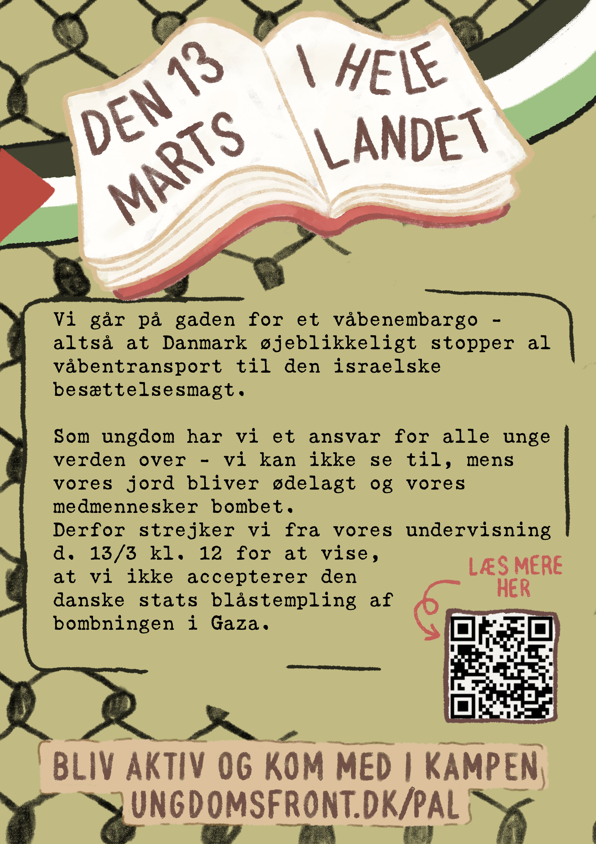 Den 13. marts kl. 12 landet over vil vi kalde til en national undervisningsstrejke, hvor vi i solidaritet med Palæstina kræver et øjeblikkeligt våbenembargo mod Israel!